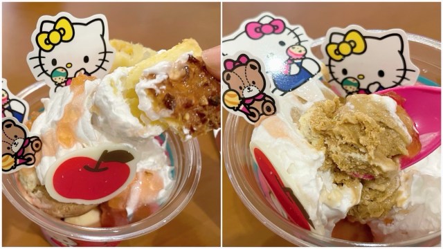 アイスの上にはサクサクのスティックパイに、リンゴ型チョコレート、角切りリンゴ入りのリンゴソースがかかったホイップクリーム、そしてキティちゃんとミミィちゃん、タイニーチャムのピックつき……と、とーってもにぎやか!