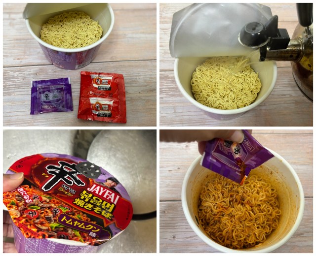 作り方は通常のカップ焼きそばと同じ。熱湯を注いで3分待ち、カップの湯切り口からお湯を捨て、粉末スープとトムヤムペーストを入れてよく混ぜ合わせたらできあがりです!