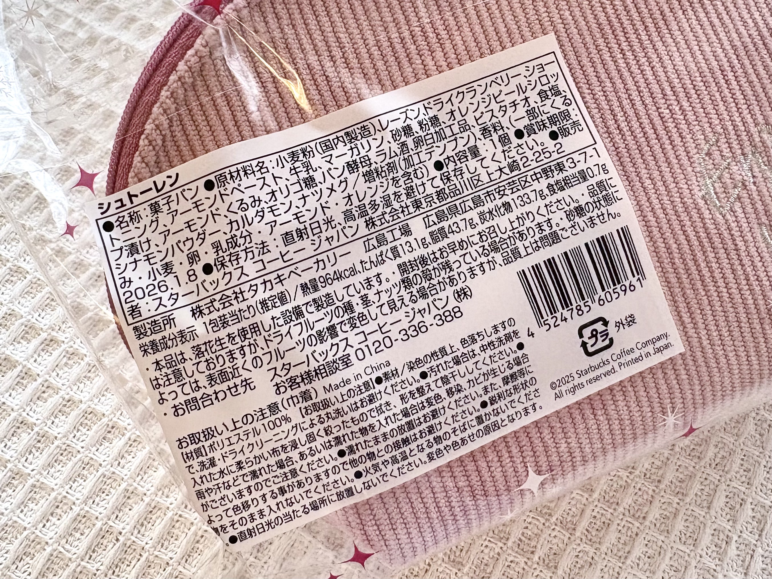 そのうれしいサプライズとは、スタバのシュトーレンはコーデュロイ生地のポーチとセットってこと。かわいらしいポーチの中に、袋入りのシュトレーンが入ってるんです。