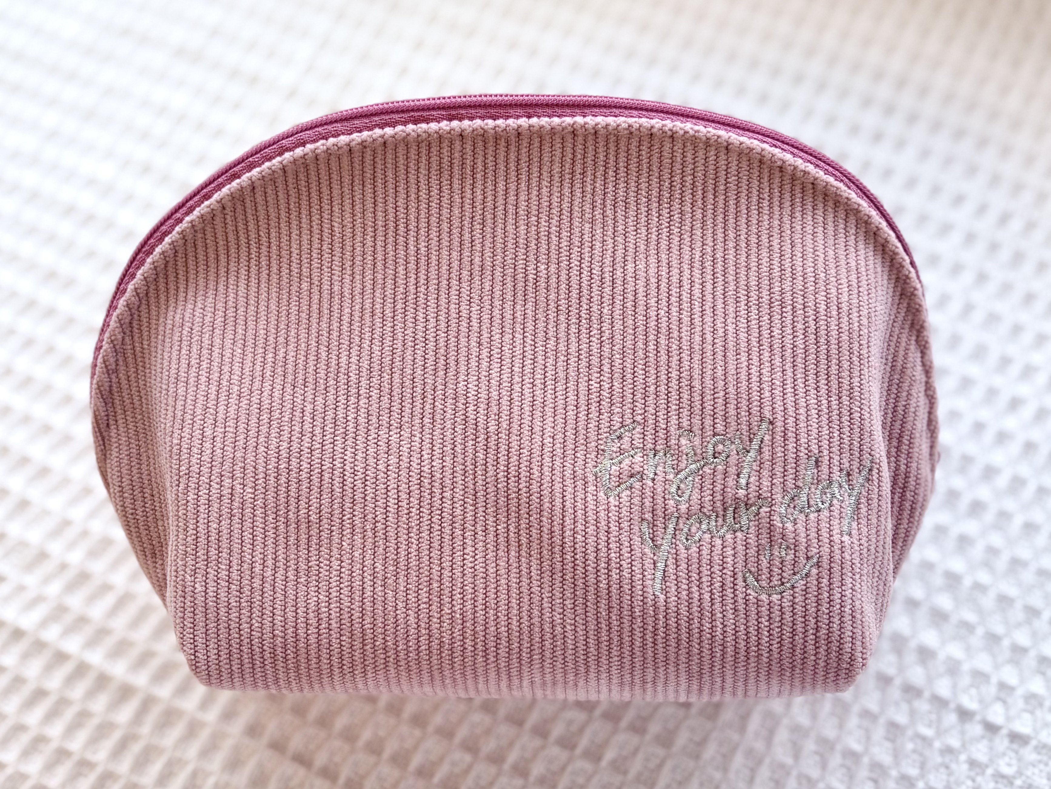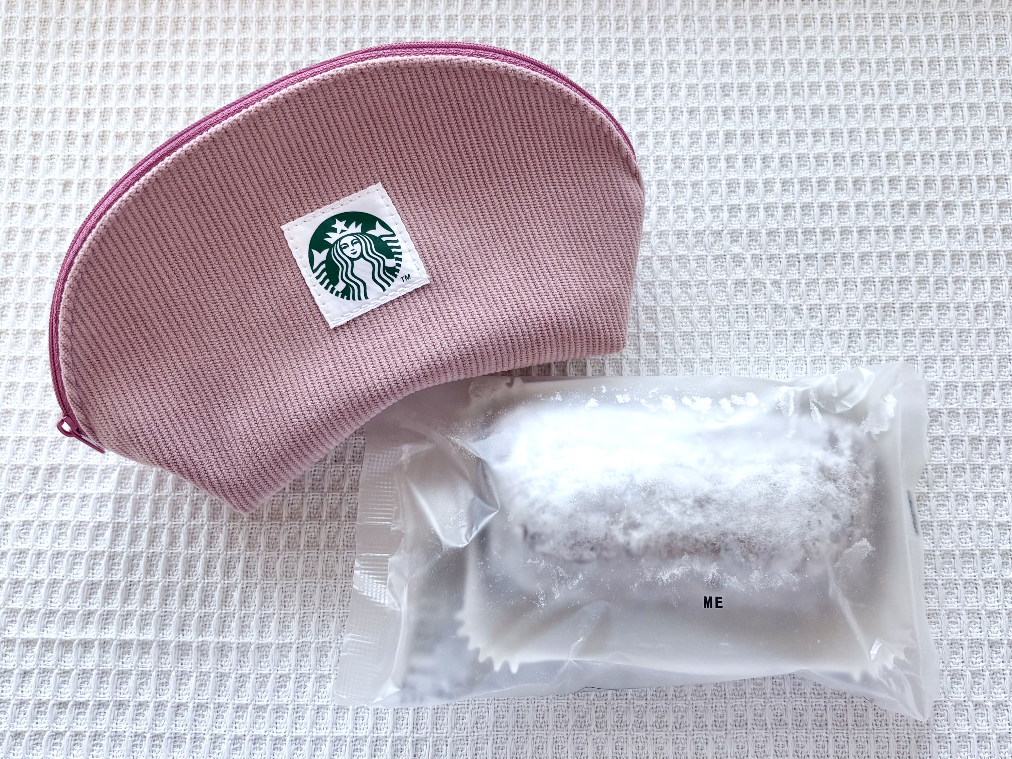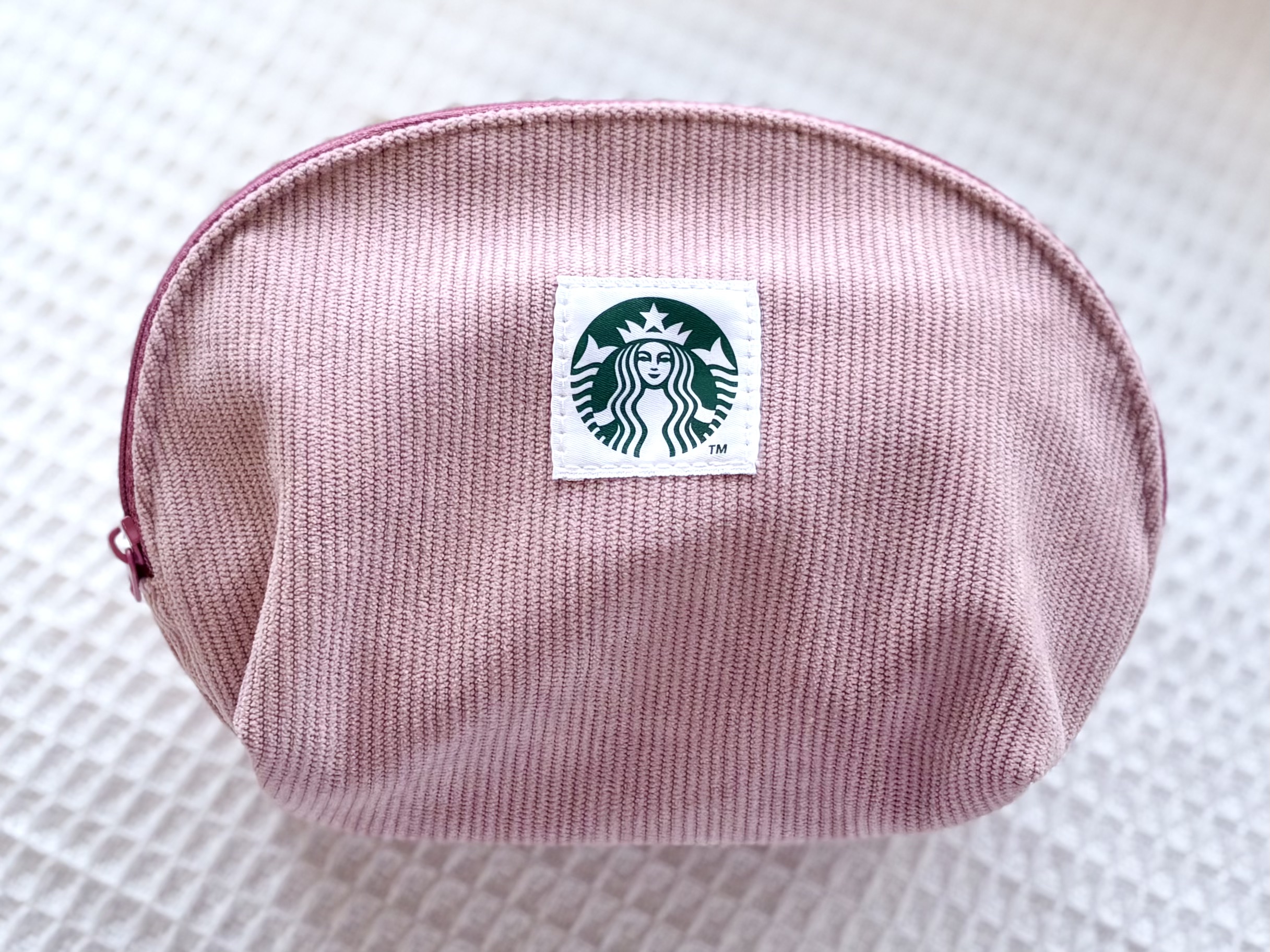 しかも、とっても高級感があるポーチなんですよ〜。大人っぽい落ち着いたピンク色のコーデュロイ生地は、すべすべでしなやかな手触り。中央におなじみのスタバのロゴマークが入ってます。