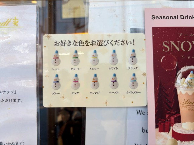 ホットとアイスとあって、私はアイスを注文しました。そしてこのドリンク、スノーマンチョコのマフラーの色を10色から選べるんですっ!!