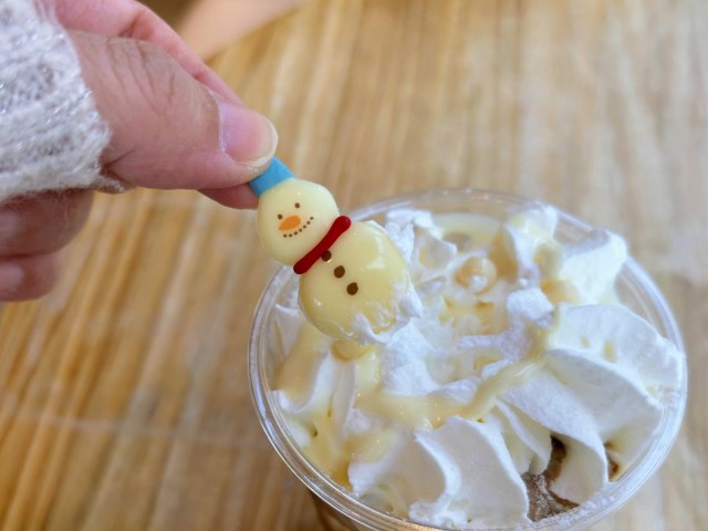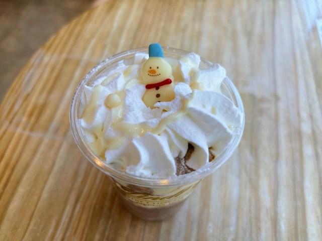 完成したドリンクは、スノーマンチョコの上に透明のフタがかぶさっていて、まるでスノードームのよう……! さっそくいただいてみましょう。
