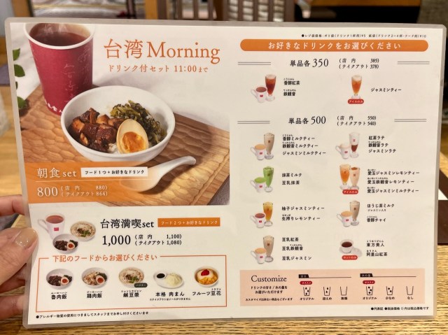 台湾モーニングドリンク付きセットは、午前11時までの限定メニュー。フード1つとドリンク1つが選べる「台湾朝食セット(880円)」と、フード2つとドリンク1つが選べる「台湾満喫set(1100円)」の2種類があります。