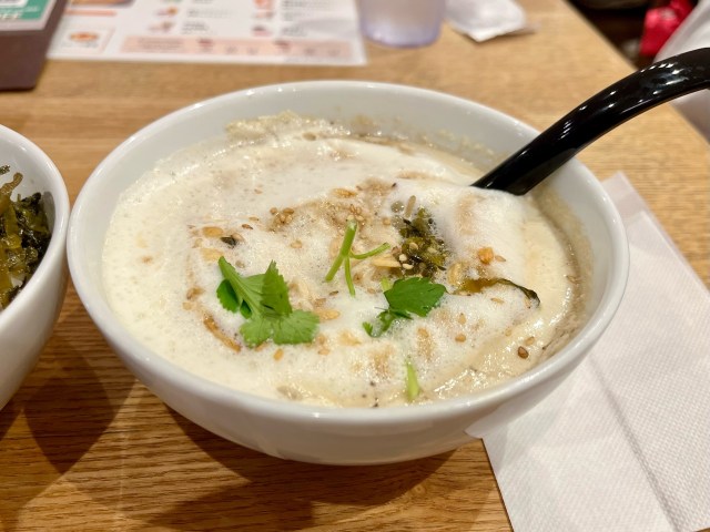 豆乳の中には、蒸し鶏、もやし、高菜などの具材が入っていて、食べ応えも抜群です。パクチーの独特な味わいもアクセントになっていていい感じ。
