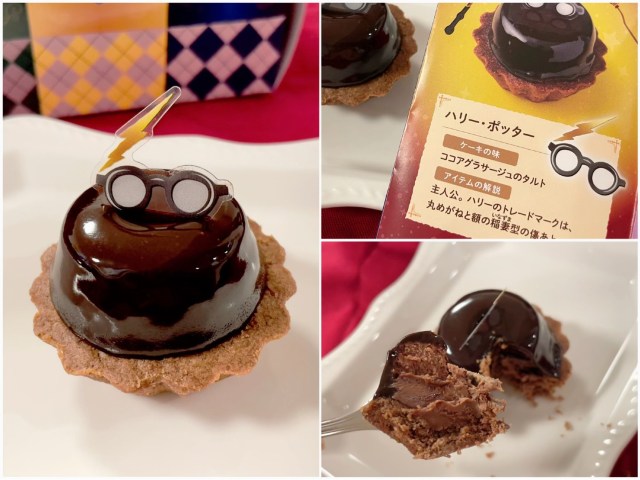 ハリーの稲妻型の傷跡とメガネがのったココアタルトです。表面のチョコレートが黒髪のハリーを彷彿とさせますね。外側は濃厚なチョコレート、中のチョコレートムースは甘さ控えめ&なめらかでした!