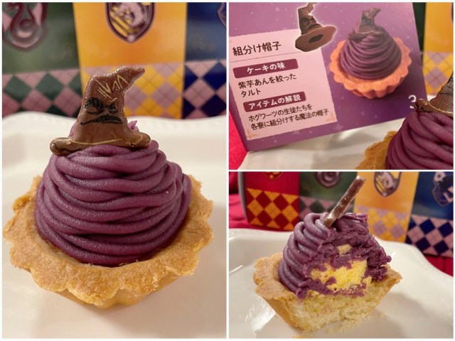 紫芋あんのモンブランタルトは上に組み分け帽子型のチョコレートがちょこんとのっています。濃厚なモンブランと中のあんのどちらもなめらかな舌触りで、おいものおいしさを楽しめますよ。