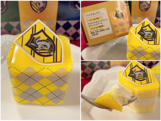 ハッフルパフの寮カラーのイエローが眩しいケーキの正体は、キャラメル味! 見た目と味のギャップがあって、魔法のようなワクワクを体験できましたっ。やさしいキャラメルホイップクリームはハッフルパフのイメージ通りかも!