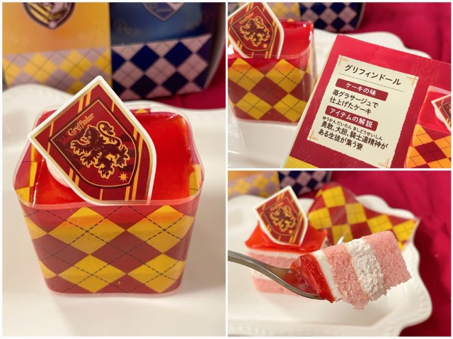 寮モチーフはどれも寮カラーに染まっていて見た目もかわいいんです! グリフィンドールのいちごホイップクリームはお菓子のようないちご味。スポンジはフワフワで軽いので、キッズ人気間違いなし◎