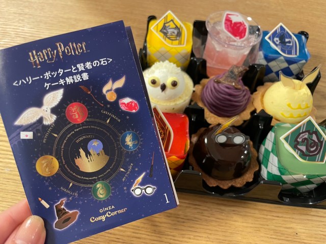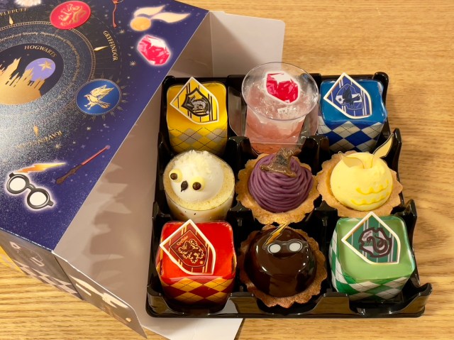 ホグワーツの4寮やヘドウィグ、スニッチなど「賢者の石」をイメージしたプチケーキが9個登場するのですが、定番モチーフのケーキたちがかわいいのなんの……!