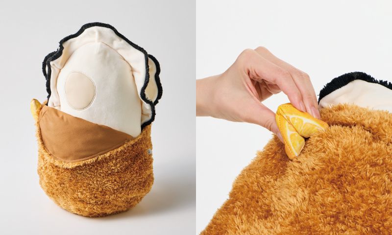 フェリシモの担当者いわく「冬のごちそう “牡蠣フライ” を再現したくてつくってしまった」という牡蠣フライカバー。その思いを反映するかのように、牡蠣フライカバーの色や質感はめちゃくちゃリアル。いまにも揚げ物のいいにおいがしそうだし、食欲をそそられちゃう。