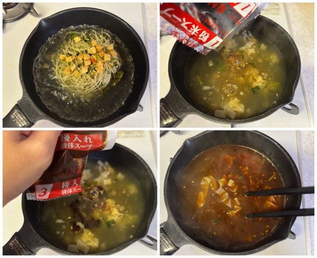 では、作っていきましょう! 鍋に水400mlを入れて沸騰させたら、春雨とかやくを入れて90秒煮込みます。次に粉末スープ、液体スープを入れてよくかき混ぜたらできあがりです。