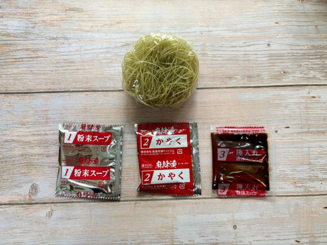 袋麺は3食入り。各袋には、春雨、粉末スープ、かやく、後入れ液体スープの4点が入っています。