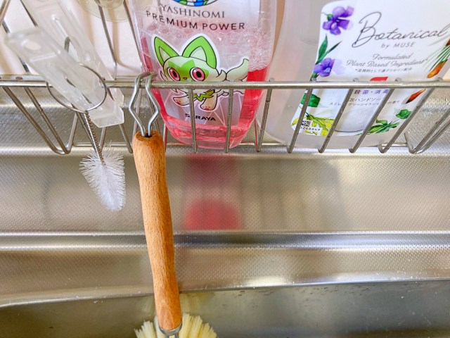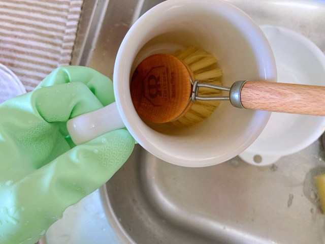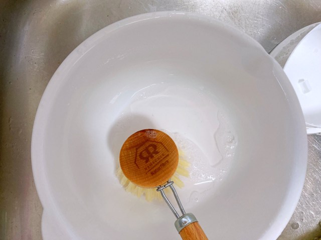 スポンジのように「揉んで泡立てる」ことはできないので、ボウルにお湯+食器用洗剤を入れて、そこにブラシをちょんと付けながら洗っていきました。