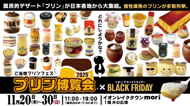 ご当地プリンフェス「プリン博覧会2025」はイオンレイクタウンmoriの1階水の広場で11時~19時の開催。最終日11月30日のみ17時終了となります。
