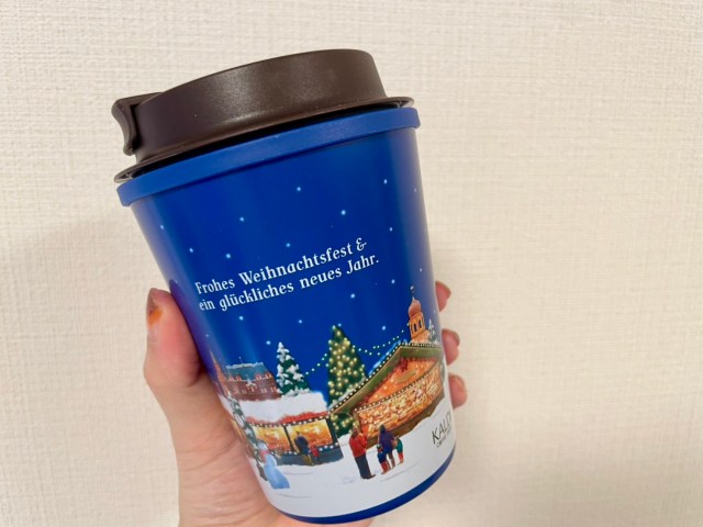 毎年ワクワクしちゃうのは、やっぱり側面のデザイン。一周ぐるっとクリスマスマーケットの景色が描かれており、どこからみてもクリスマス気分に浸れちゃうのです。あたたかい灯りの中に、プレゼントの袋を持ったサンタさんの姿も発見!