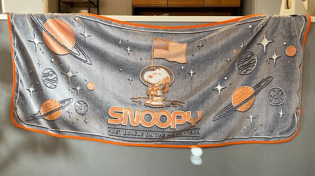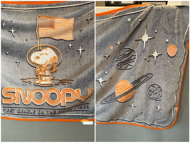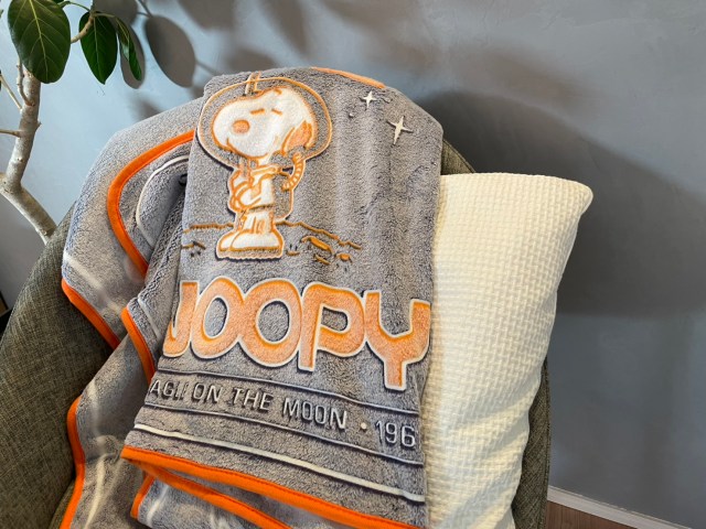 宇宙服を着たスヌーピーをセンターに、ブランケット一面に惑星や輝く星たちが散りばめられたデザインになっています。ベースになっているブルーシルバーやアクセントのオレンジも宇宙らしい雰囲気あり。