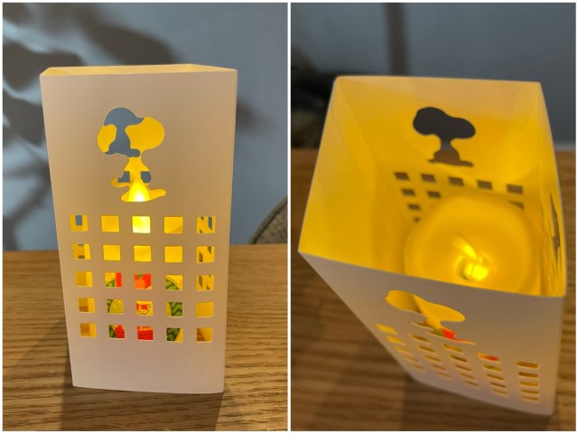 スリーブを被せればインテリアにもなじみそうな落ち着いた印象に。スヌーピー型の窓から見えるぼんやりした灯りがいい感じだ……! こちらはクリスマスを過ぎても使えそうです。