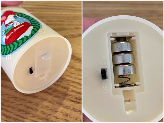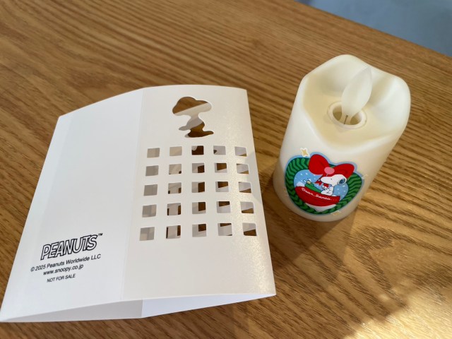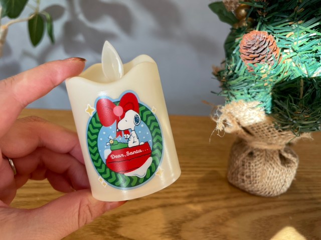 キャンドル型のライトは場所を問わず置きやすそうな手のひらサイズ。リボンのついたクリスマスリースとスヌーピーの冬らしいデザインがかわいいのです♡