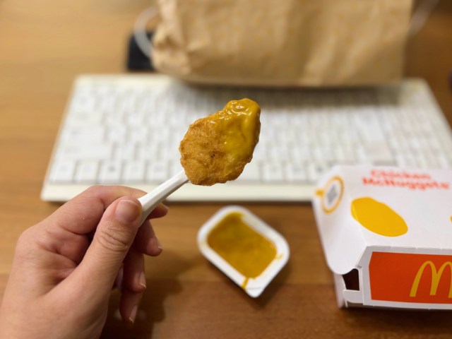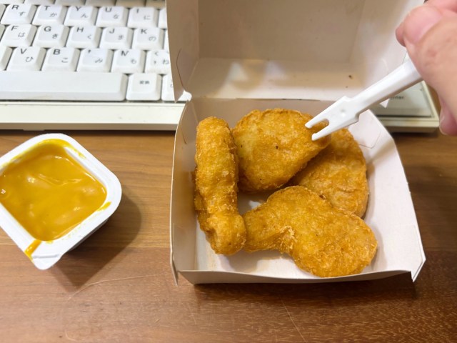 ハンバーガーはよいものの、困ったのがチキンマックナゲット。手でつかむと油やソースがつくし、その手でキーボードを触りたくないし、いちいち拭くのもメンドウだよー。
