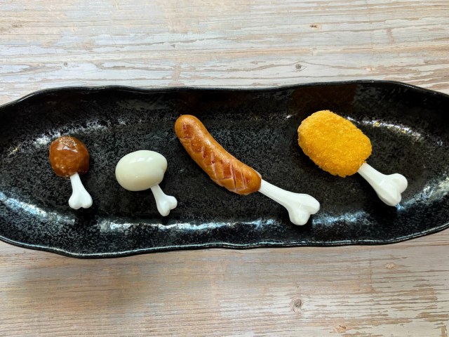 このピック、ミニサイズではありますが、動物の大腿骨をモデルにしたというだけあって、骨の形や質感がとんでもなくリアル。食べ物に刺しただけで、途端にいわゆる「マンガ肉」を作れますよ。