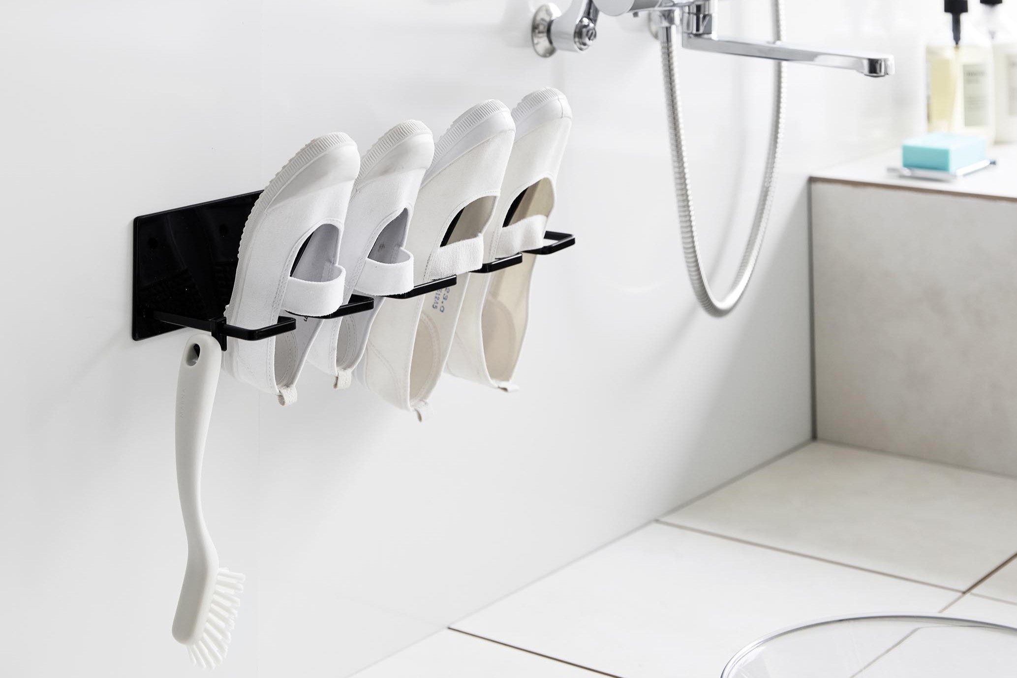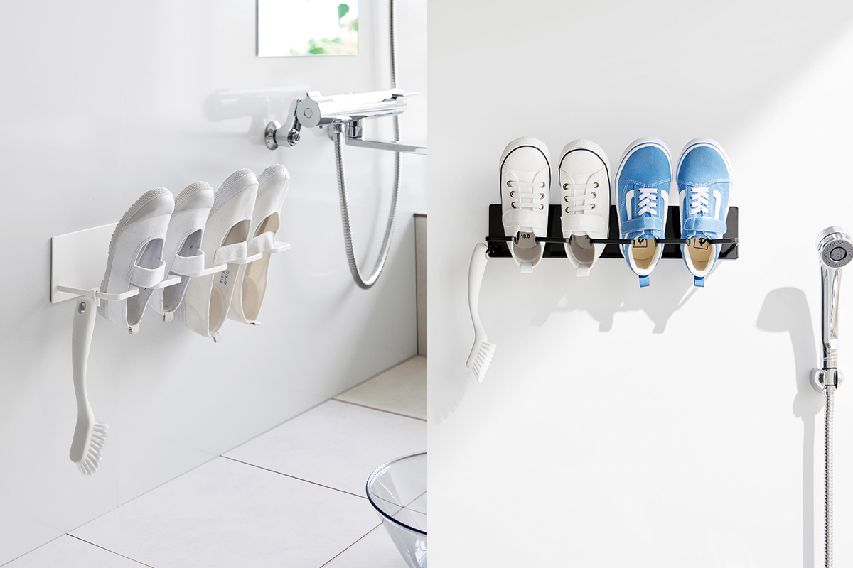 お子さんがいるなら、きっと欲しくなっちゃうであろうシューズハンガー。上履きやキッズシューズに対応しており、マグネットでバスルームの壁に簡単に取りつけられます。水切れを考えた斜め設計かつ、ブラシなどの収納に便利なフック付き。