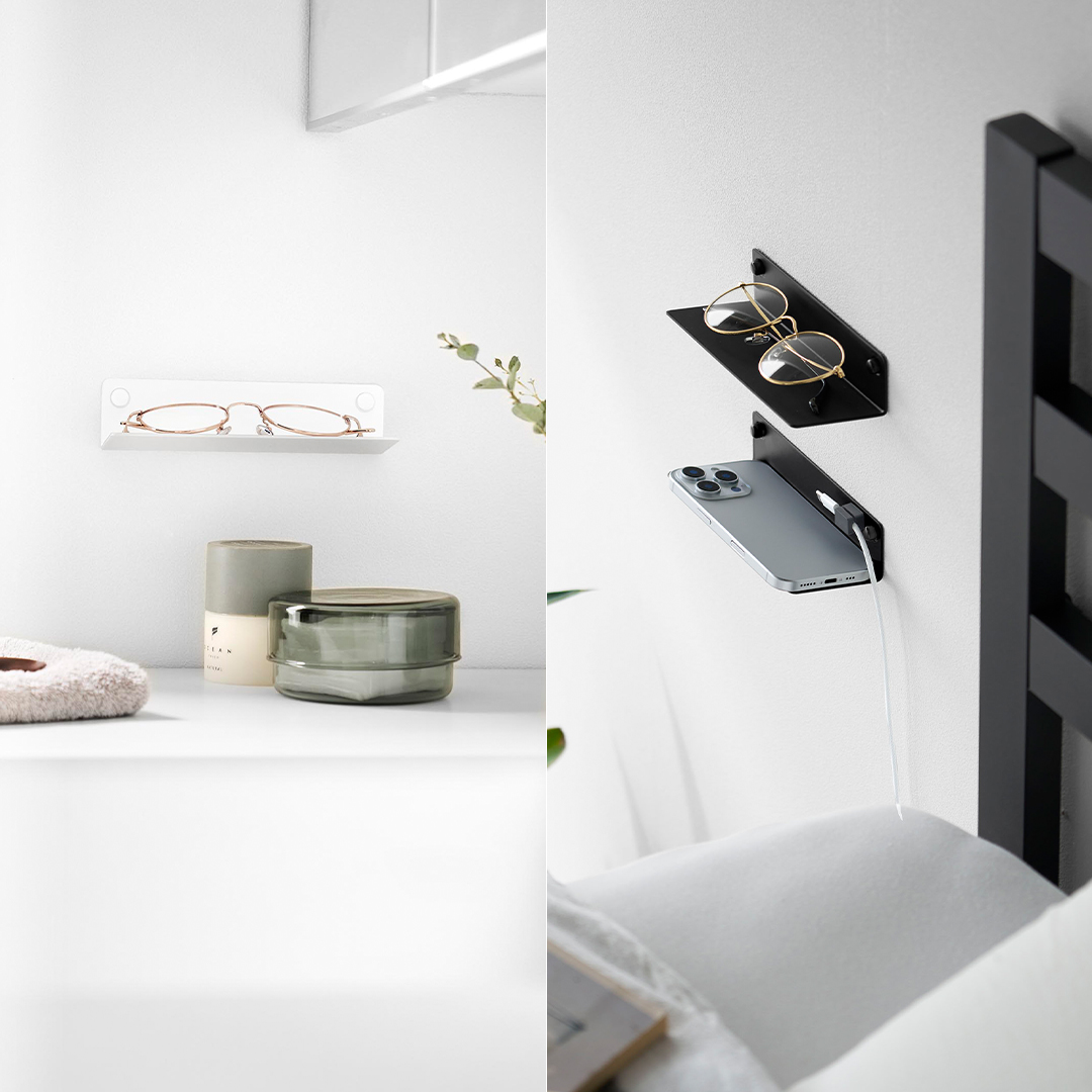 石こうボードピンで壁に浮かせて設置できるメガネラック。充電ケーブルを取りつけられるマグネットケーブルホルダーを装備しており “スマホ置き” としても重宝します。落下や傷を防ぐすべり止めシートつき。