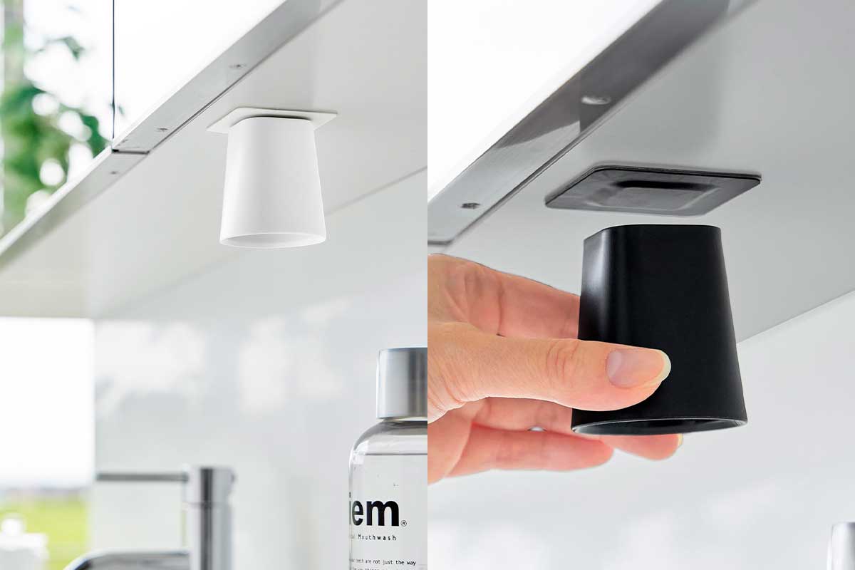 洗面台の戸棚下などにくっつけて収納できるマウスウォッシュタンブラー。逆さに収納するため、水切れもよく清潔な状態で保管できちゃいます。歯磨きやうがいにちょうどいい60mlサイズ&10mlごとの目盛り付き。
