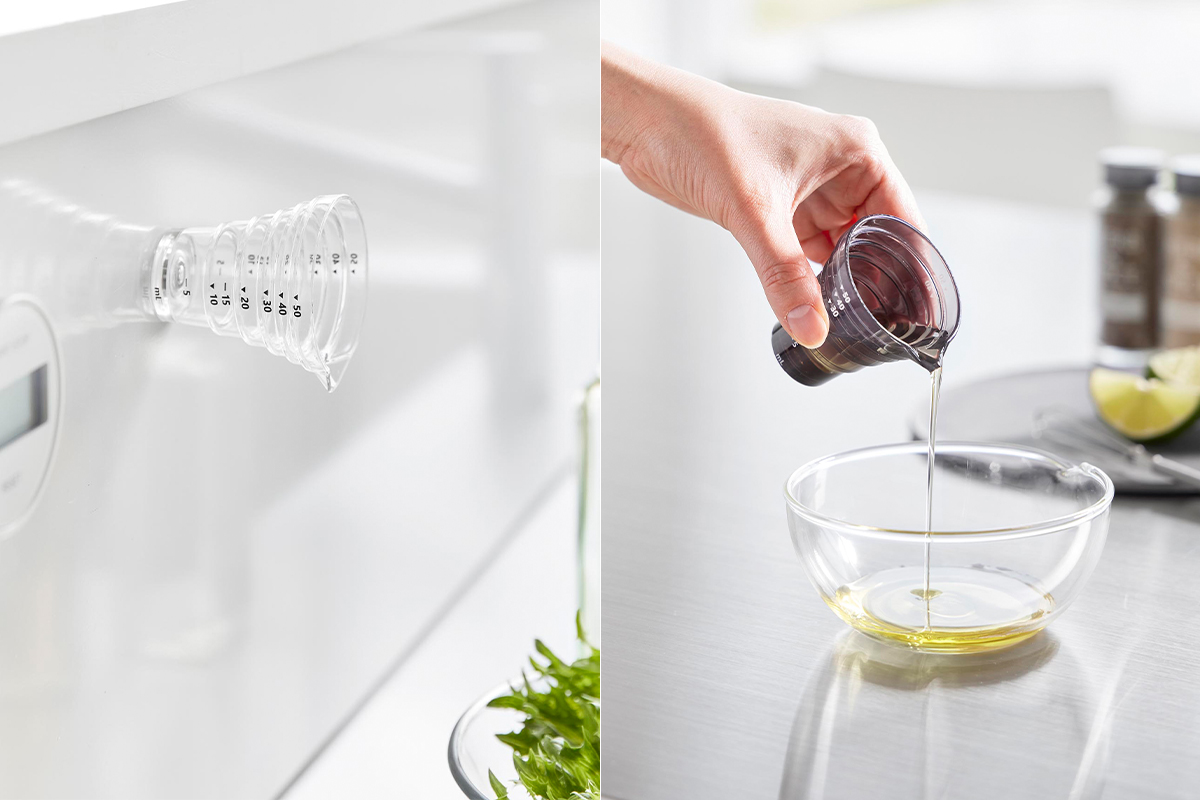 キッチンパネルやレンジフードなど、マグネットがつく壁面に浮かせて収納できる計量カップです。さっと使えて便利だし、10mLごとに段差があるため、上からでもひと目で計量できちゃう。大さじ・小さじが量れるメモリもついています。
