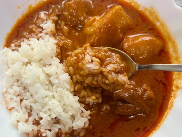 まずは、辛口から。……おぉぉ、ココナッツミルクの華やかな甘さがただよいながらも、しっかりスパイシー!