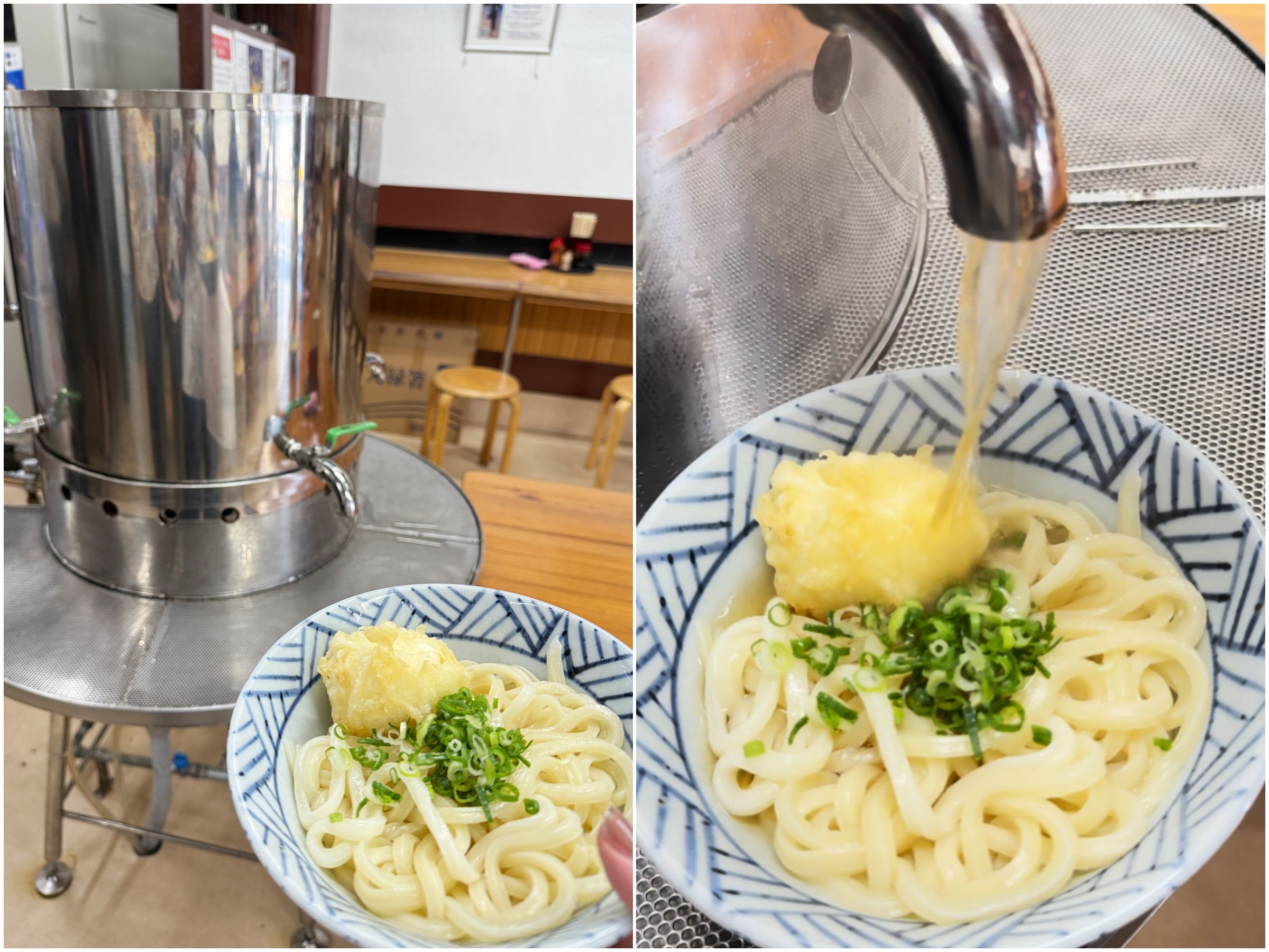 最後にこれまたセルフでつゆを注ぎます。まるで食堂の麦茶みたいな勢いで注がれるつゆに思わず笑いが……これで私の讃岐うどん、完成〜!