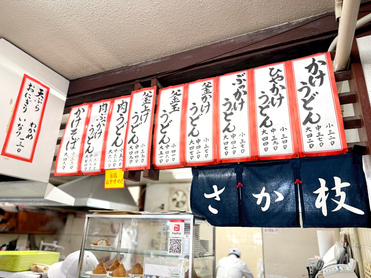 店内に入ると、観光客でなく地元の方もたくさんいて賑わっていました。メニューはかけ、ひやかけ、ぶっかけ……と並んでいて「かけ 小」は320円とかなりお手ごろ価格。「天ぷら わかめ おにぎり いなり」は130円です。