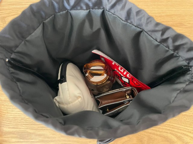 ミニバッグくらいの大きさがあり、お財布、ドリンクボトル、ポーチ、お菓子を入れてみてもまだ余裕あり!