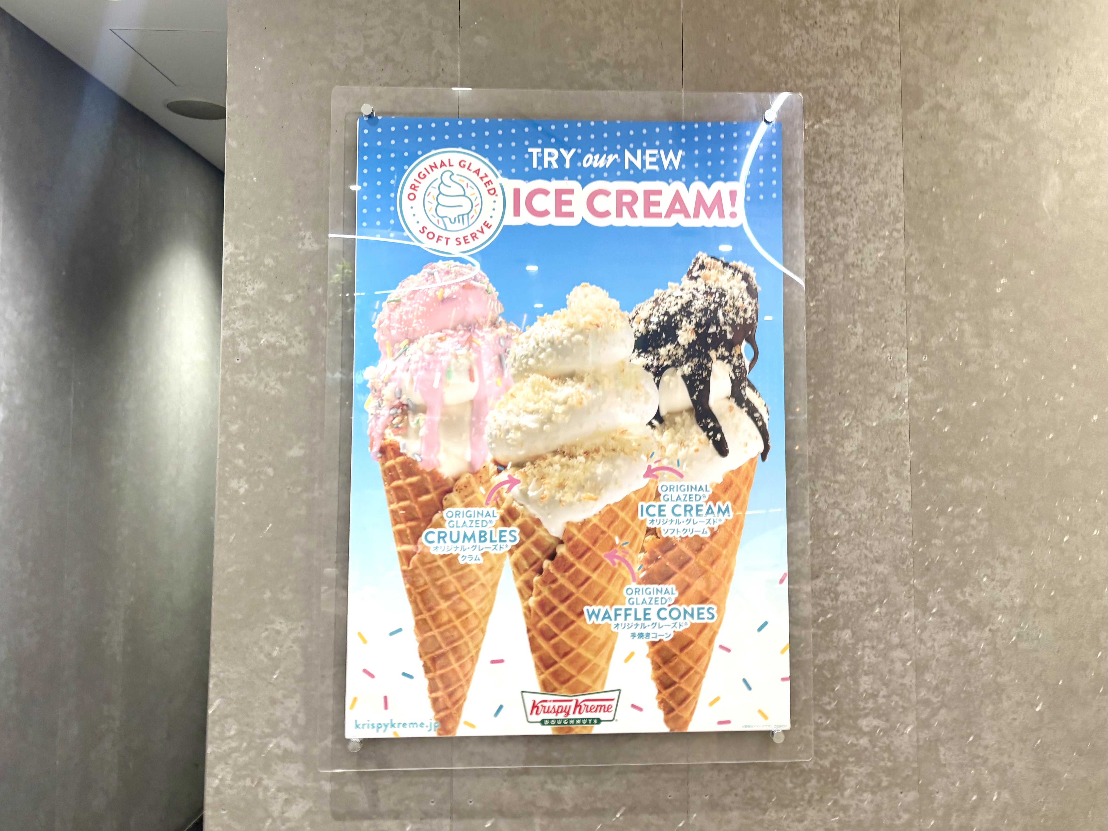 大きなガラス張りのお店の中は、とっても広くて開放的な雰囲気。うわぁ、ステキ!と店内を見渡していると、目当ての商品のポスターを発見しました。そうそう、この「オリジナル・グレーズド ソフトクリーム」を食べにきたのよ〜!