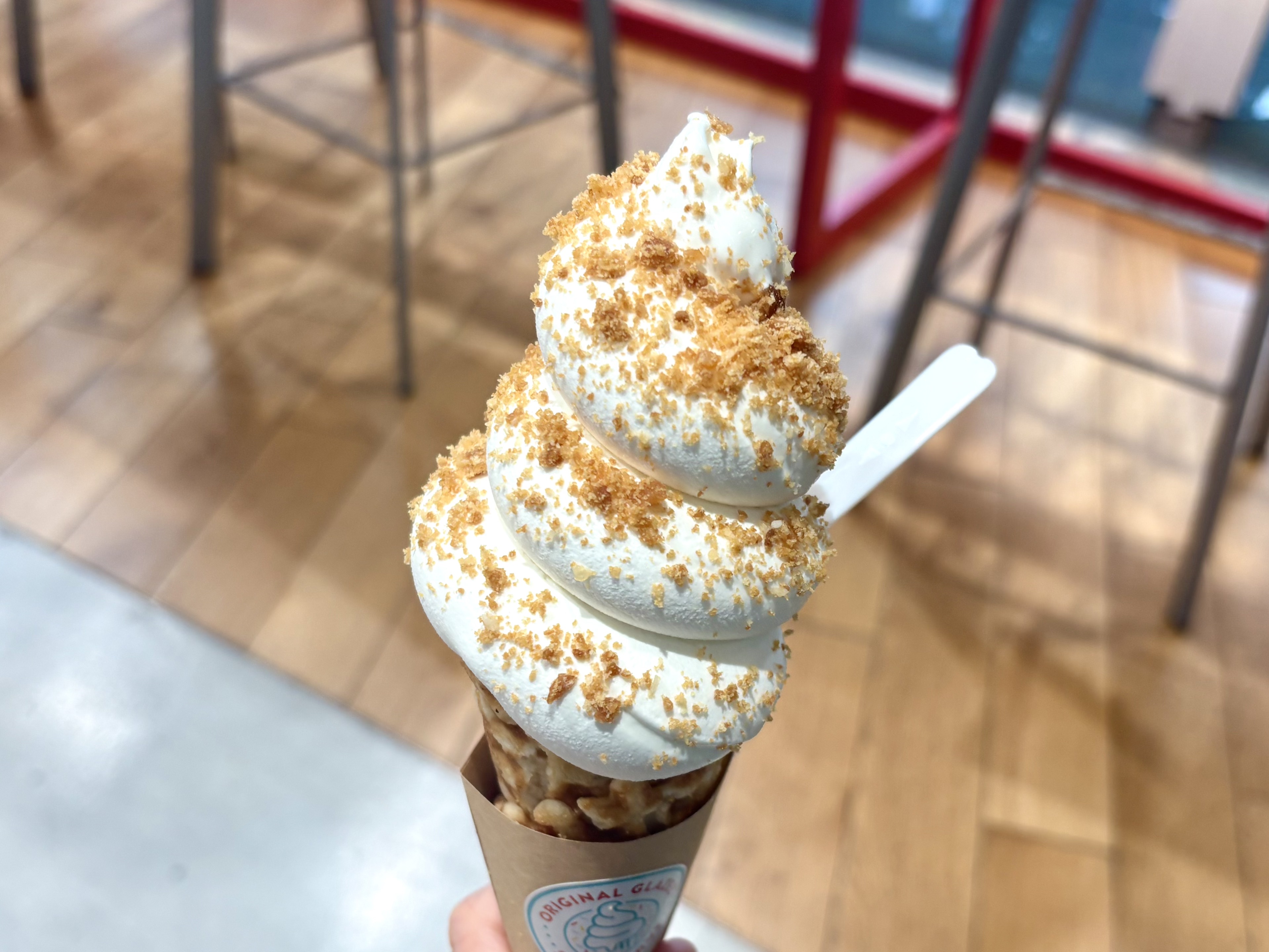 オリグレレシピを使って店内で手焼きしてるというだけあり、このワッフルコーンだけでもスイーツのような満足感がありましたよ。ソフトクリームのボリューミーさと相まって、お腹もいっぱいになりました。