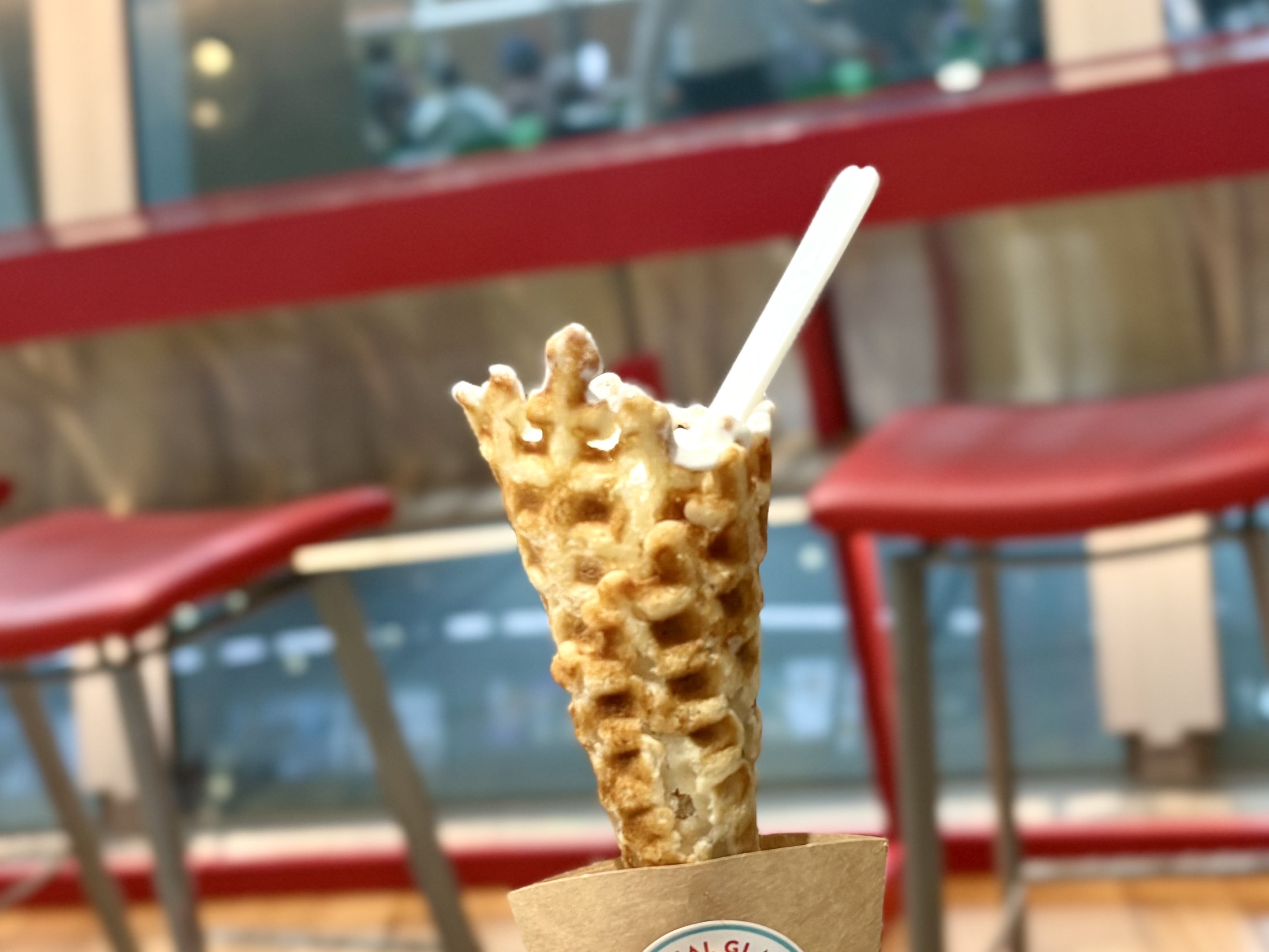 溶け出す危険のある部分をしゃかりきに食べ終えたところで、ようやくホッとひと息。少し落ち着いて口をつけれたワッフルコーンは、薄焼きのパリッと系ではなく、厚めでしっかりとした食べ応えがあるタイプ。