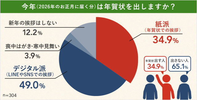今は紙の年賀状を出すほうが少数派で、デジタル派が多くなってきていることがわかりますね。