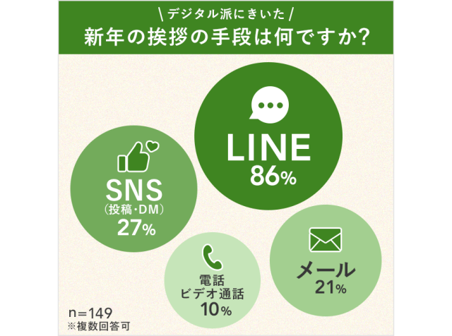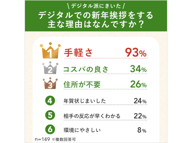 今では多くの人が利用するデジタルツールでの新年の挨拶ですが、やはり「手軽」「コスパがよい」「ペーパーレスでエコ」といった点が大きな魅力となります。