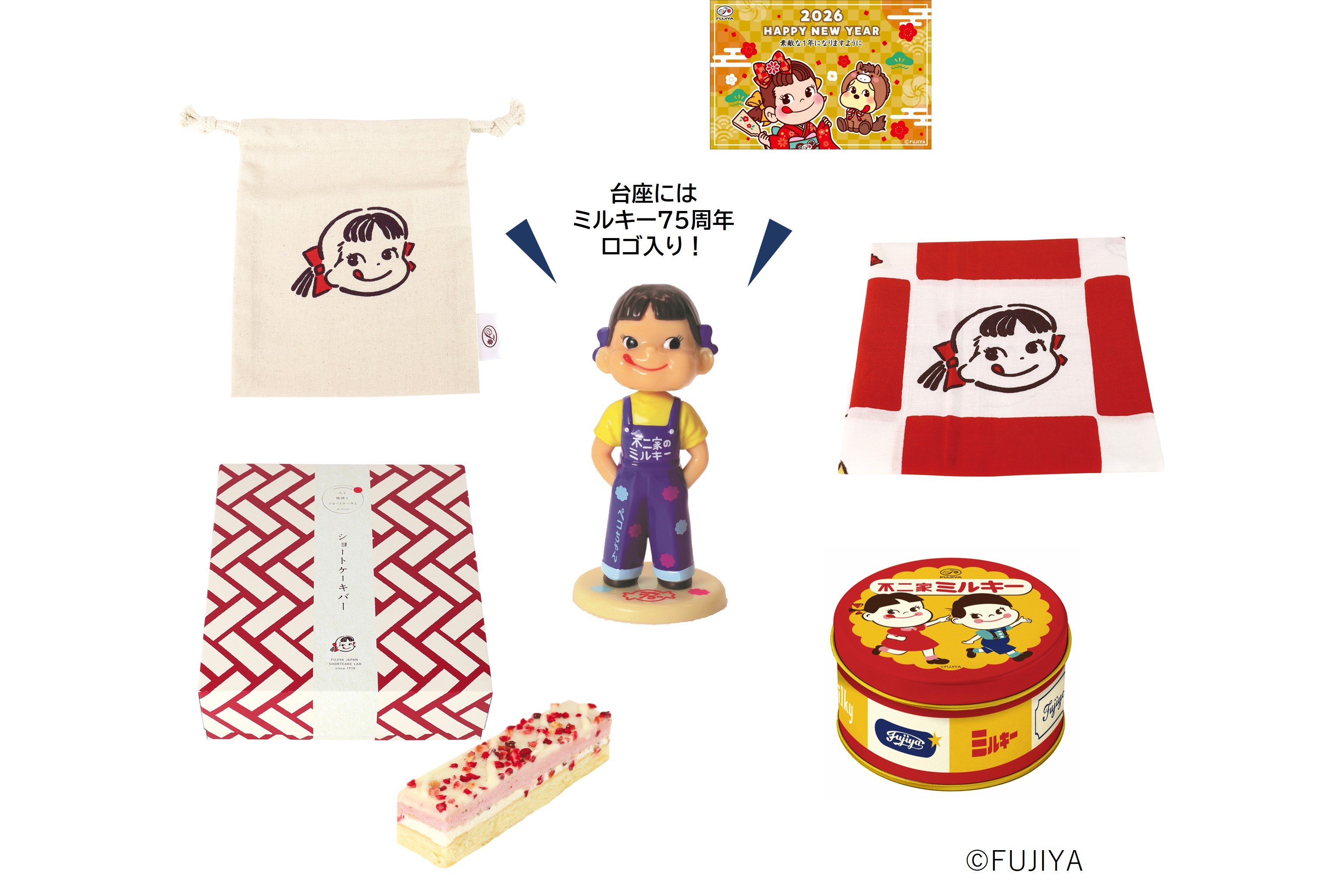 内容:ミニレトロペコちゃん人形、オリジナルグッズ、お菓子など