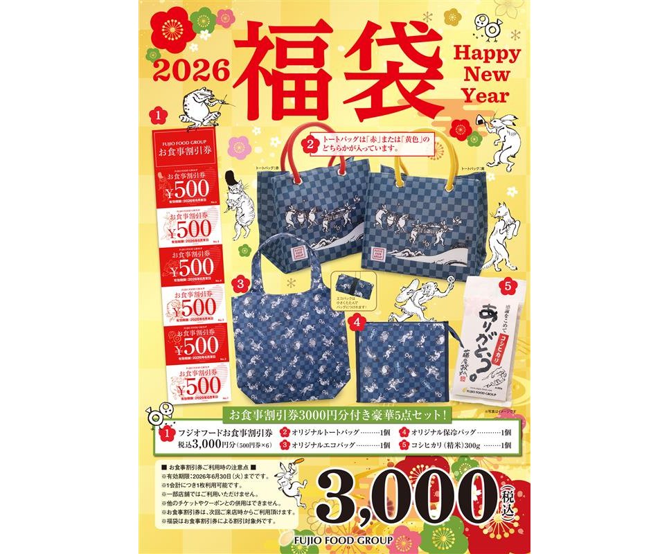 ※「まいどおおきに食堂」「串家物語」「さち福や」「麺乃庄つるまる」「はらドーナッツ」などの約700店舗で販売。福袋の売上の一部は世界遺産「高山寺」の維持費用などにあてられます。