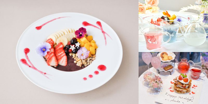 エディブルフラワーを飾りつけたアサイーボウルやクロッフル、アフタヌーンティーセットなどを用意。さらには24種類のオリジナルドレスアップティーを使用したティーカクテルやミルクティー、ティーを存分に楽しめるティーハーブティープランも!