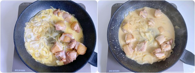 ③鶏肉と玉ねぎに焼き目が付いたら水・コンソメ・コリアンダー・パプリカパウダーを入れ、フタをして鶏肉の中まで火を通します。
