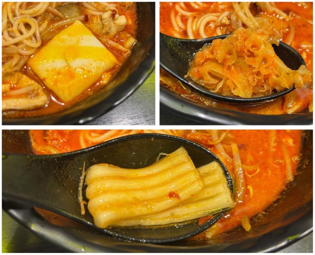 鶏むね肉やにら、もやし、棒湯葉などは定番ですが、目を惹いたのが香港カニカマや白キクラゲ、そしてブンモジャといった具材。これってあきらかに、いま流行中のマーラータンを意識しているのでは……!?