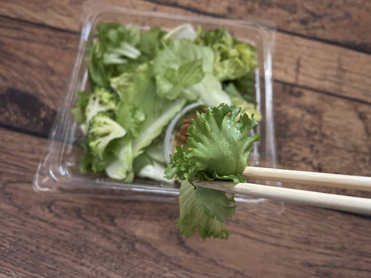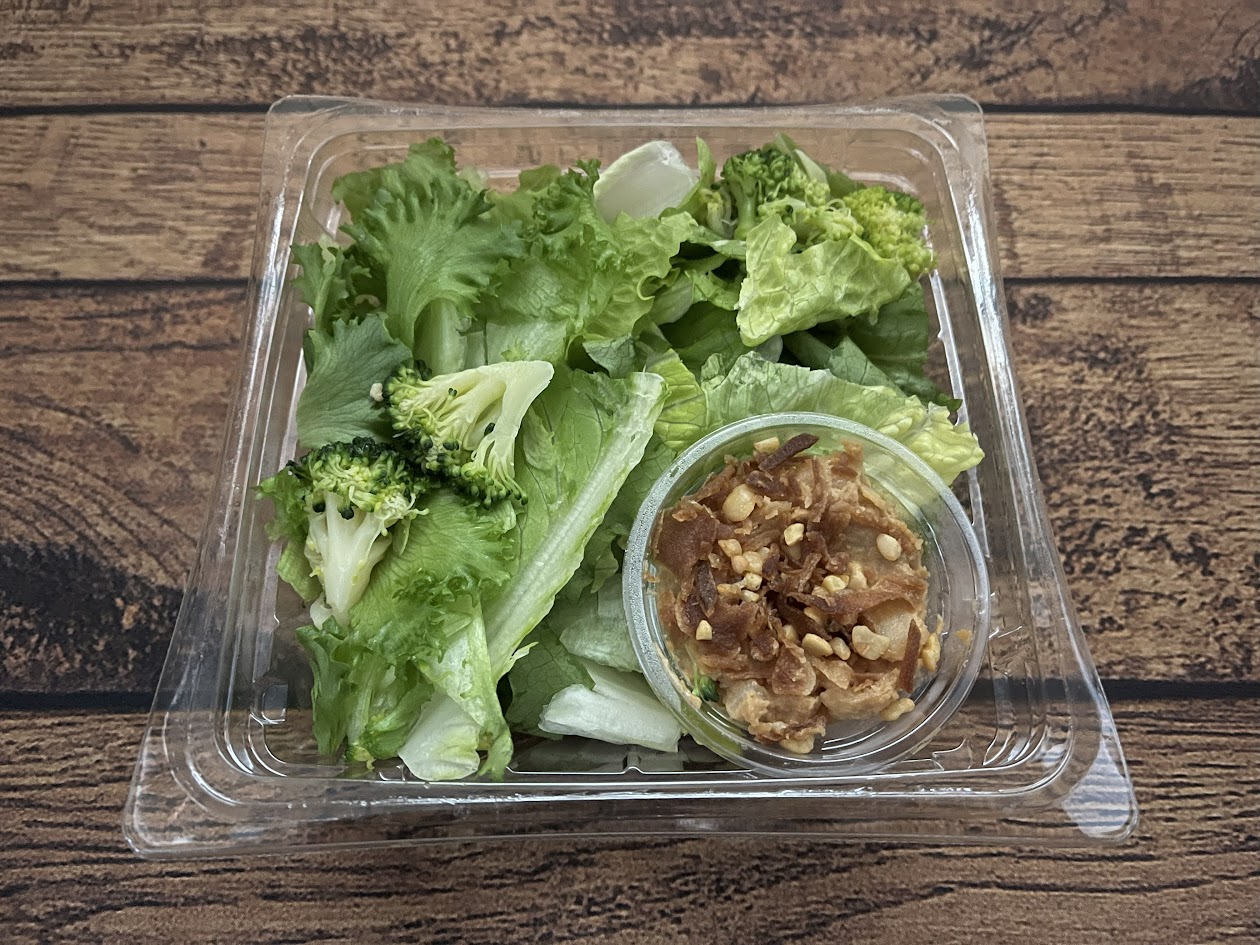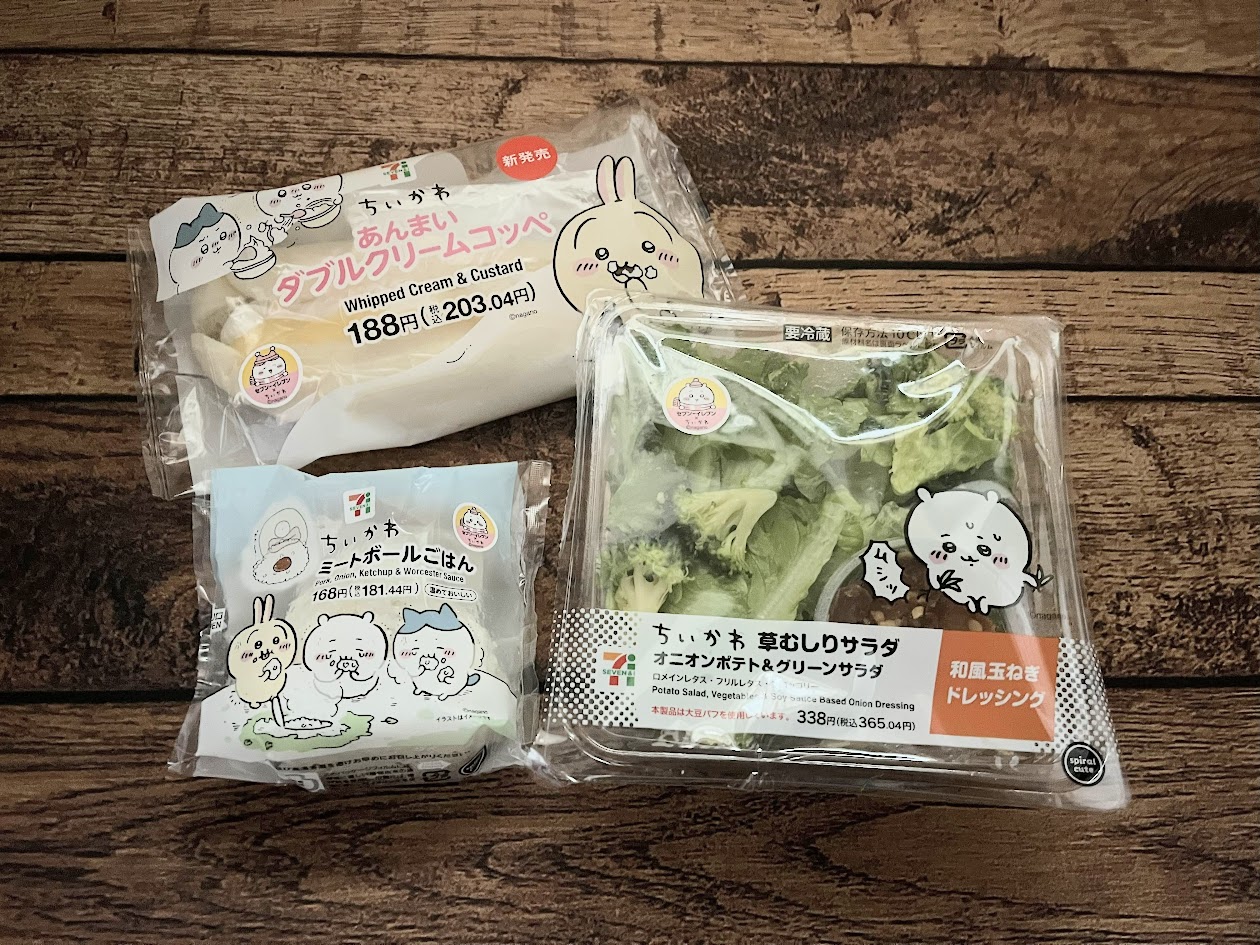 草(ロメインレタスとフリルレタス)のほかには、オニオンポテトやちいかわが苦手だったブロッコリーも入っていて食べ応えもたっぷり。和風玉ねぎドレッシングの味わいも、シンプルながら美味。それにしても、敢えてブロッコリーを入れるだなんて、なにかしらの意図を感じちゃうわね。セブンのなかの人、もしや結構ガチなちいかわファンなのでは……。