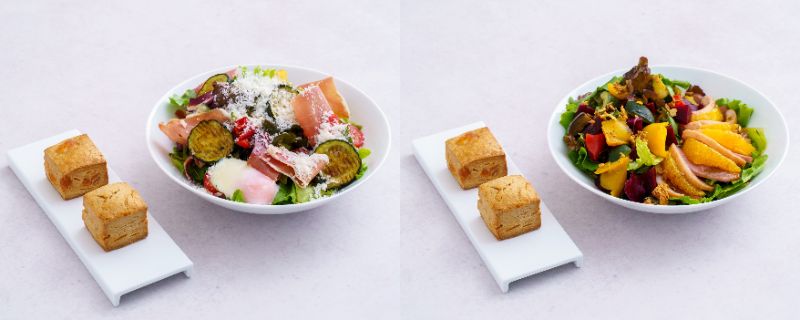 彩り豊かな「鴨肉とオレンジのサラダ」と「生ハムのシーザーサラダ」をラインナップ。全粒粉と発酵バターを使用した自家製スコーンのセットには、スープ、ヨーグルト、ドリンクが付きます。