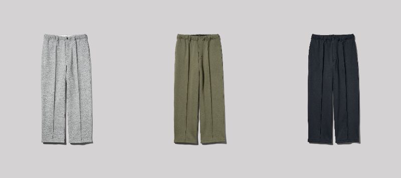 ④と同素材のスウェットパンツでセットアップでも着れちゃいます。スウェットだけど、センタークリース(縦にプレスされた折り目)により「きちんと感」を演出できる優れもの。