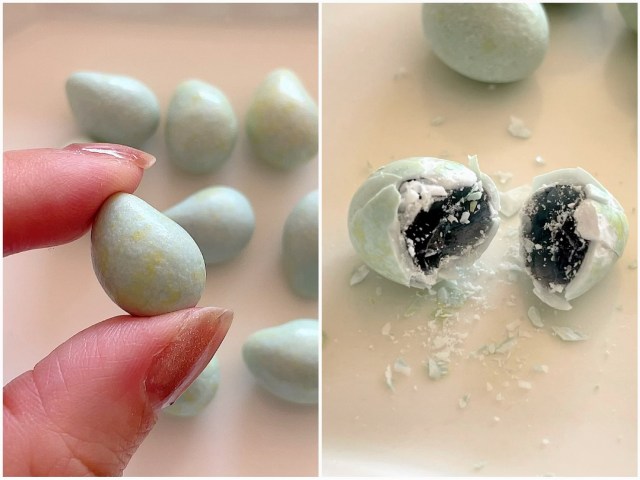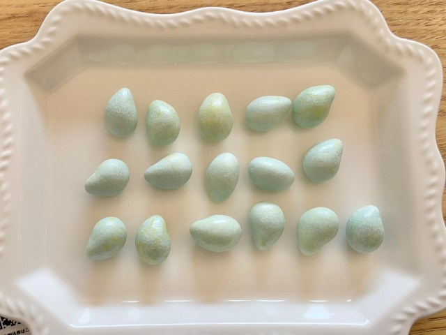 グミはガッツリ硬いコーティングに不思議な形が果実の種のよう。薄いエメラルドグリーン色が儚くて、なんだか妄想が膨らむ美しさです〜。