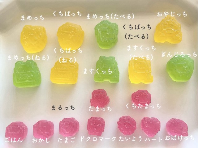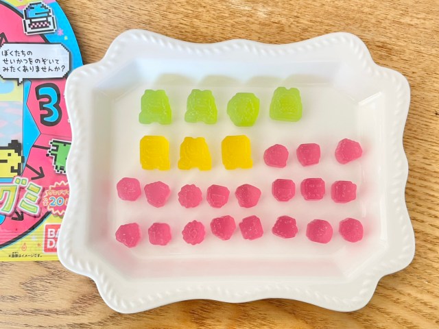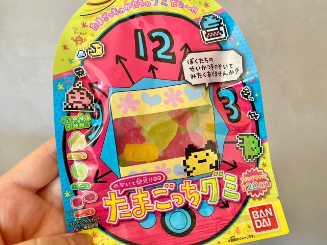 グミはレモン味・マスカット味のたまごっちたち、りんご味のアイテムの3つの味が楽しめます。小粒でもむっちりもちもち、味も濃いめでパクパクいけちゃうお味でした◎ 数粒まとめてミックスして食べるのもオススメ!