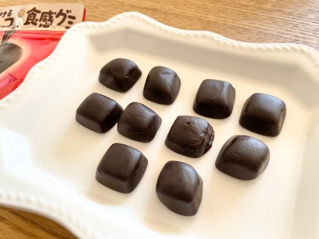 「とろける生チョコ食感グミ」というワードが気になるチョコのグミ。パッケージも「グミ」の文字がなければチョコだと勘違いしてしまいそうです。