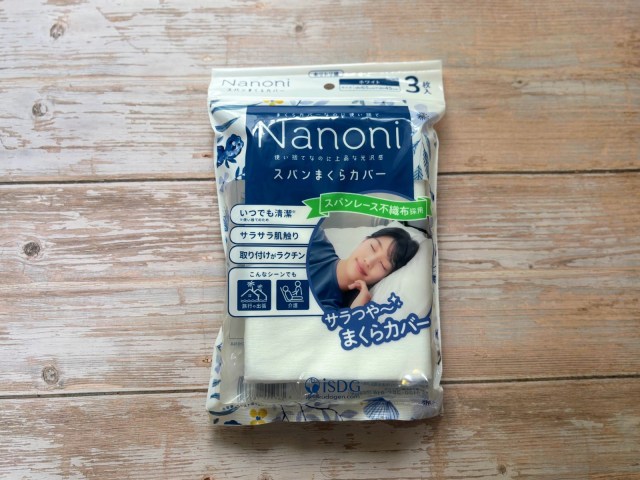 「Nanoni スパンまくらカバー」(3枚入り/ 438円)は、従来の使い捨てまくらと違って、スパンレース不織布を使っているのが特徴なんだそう。