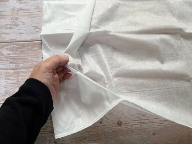 スパンレースとは高圧水流で繊維を絡みあわせて作る不織布の製法で、これにより光沢のある生地感を出せるのだそう。たしかに、生地を見てみるとさらさらツヤツヤしていて、見ようによってはまるでシルクのような上品さが感じられます。